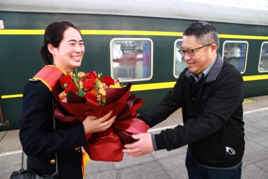 彭家辉总经理代表全司职工,将芬香吐蕊的鲜花献给乔静同志,送上bv伟德国际1946人最美好的祝愿。孙卫东主席带领政治部、工会、阜阳中心站负责人专程前往阜阳火车站,迎接乔静同志回阜。