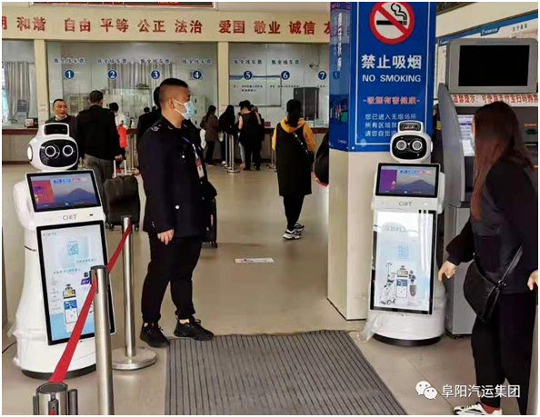 “体温正常”,“您好,有什么可以帮您?”在阜阳汽车东站候车室内,智能机器人正站在售票大厅入口处认真工作。