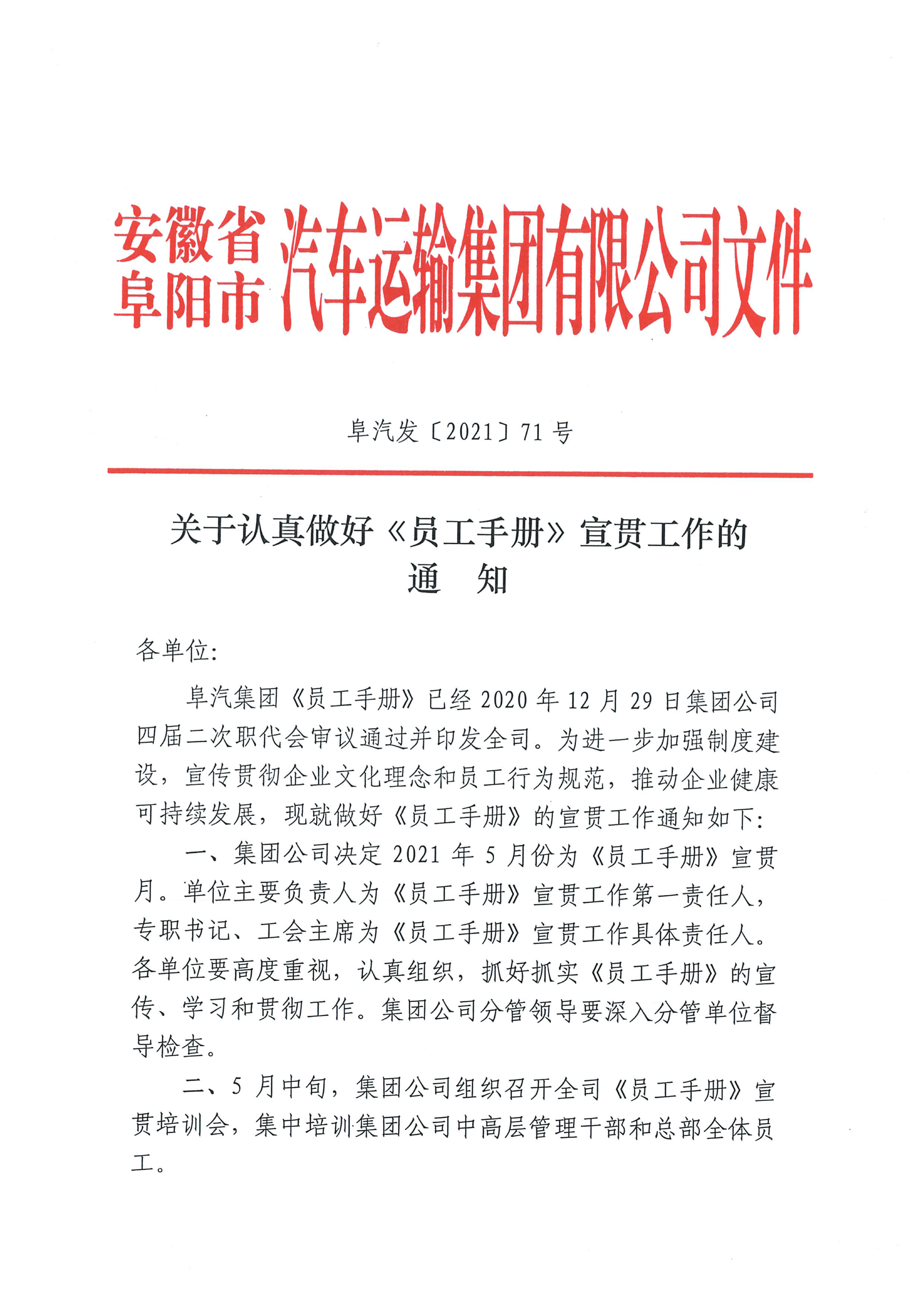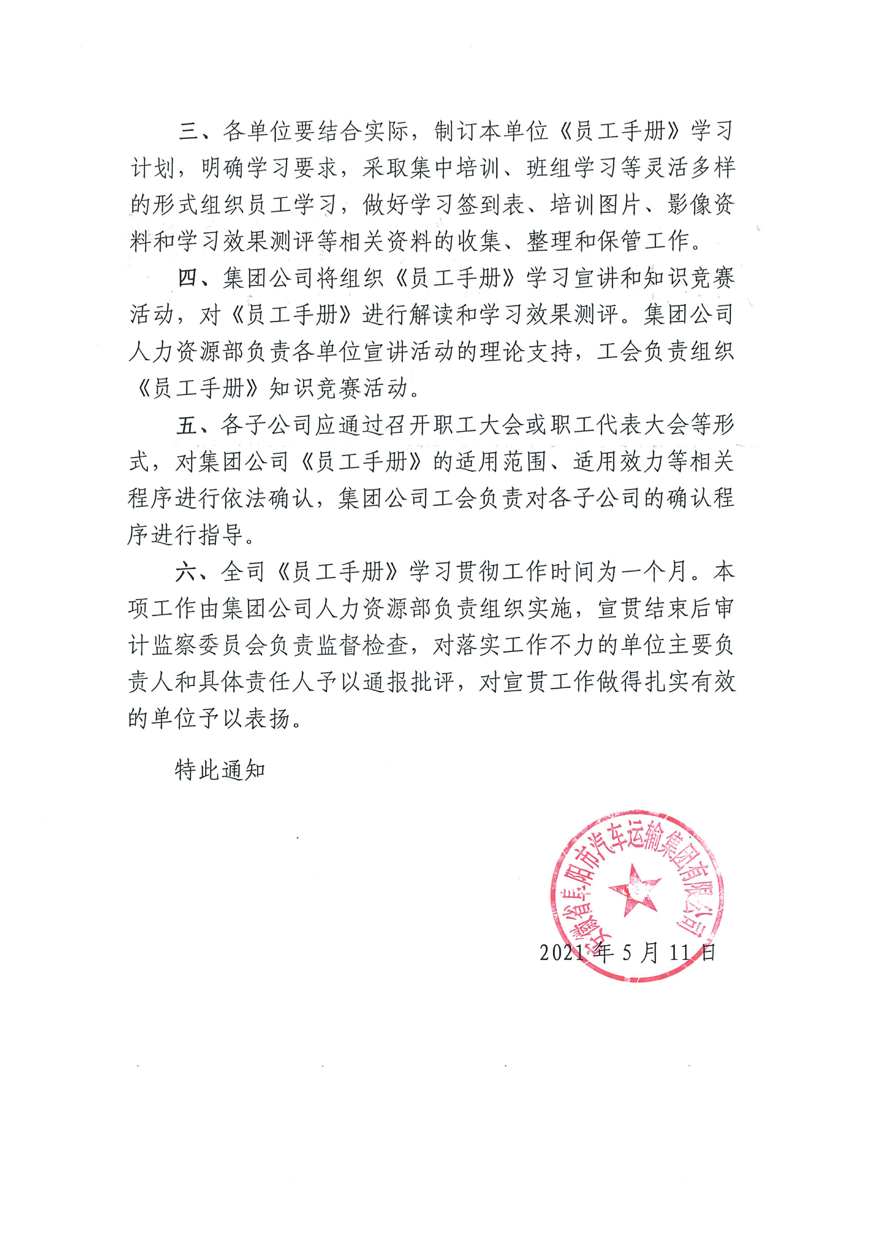 关于认真做好《员工手册》宣贯工作的通知