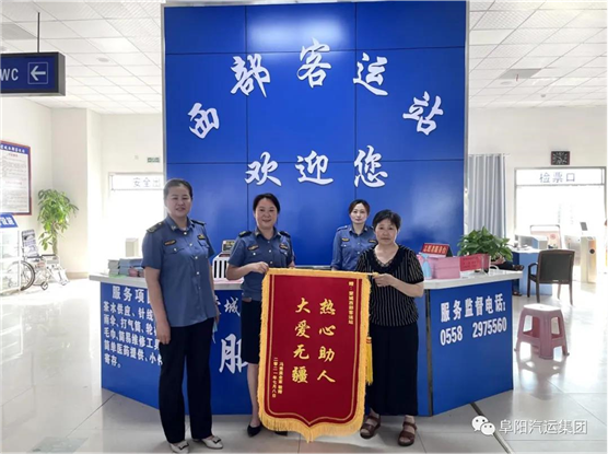 79日,旅客冯秀美来到蒙城西部客运站赠送感谢锦旗,上面写着“热心助人,大爱无疆”,感谢西部客运站员工帮助找回离家出走的孩子。